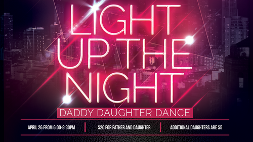 💃 Join us on April 26, from 6:00-8:30pm for our "Light up the Night" Daddy Daughter (Glow) Dance, intended for daughters age 5 through senior in high school. Tickets are $20 for each father & daughter (additional daughters are $5) and this includes the cost of dinner as well. You can purchase your tickets here.