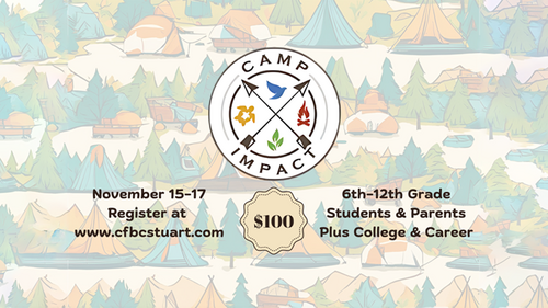 Our 2024 Fall Retreat will take place from November 15-17 at Camp Impact in Okeechobee, FL. This retreat is designed for current 6th-12th graders, college age students, and their parents, with the option for students to attend without their parents. Activities will include: worship, Bible studies, and recreational fun like water slides and bonfires.